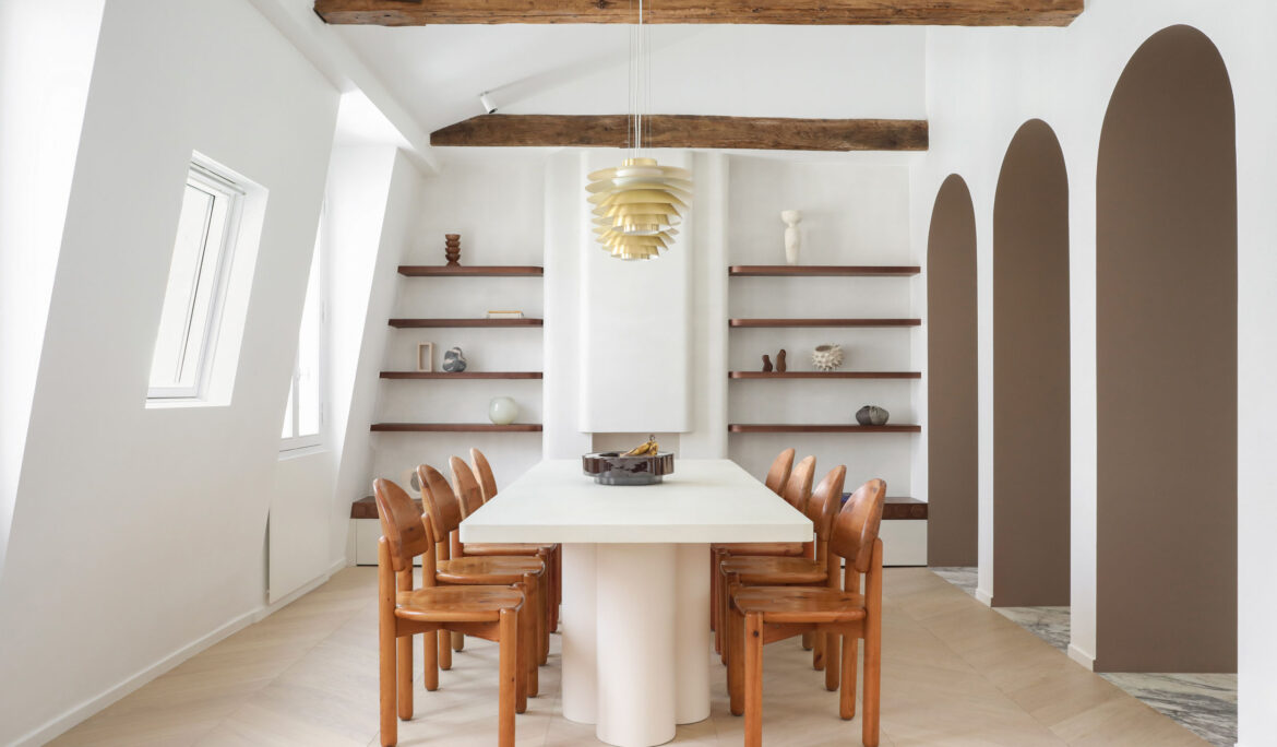 Ce projet met en dialogue le patrimoine existant et une écriture contemporaine douce. Les poutres apparentes en bois massif ont été conservées et mises en valeur, créant une tension élégante entre structure brute et volumes minimalistes.