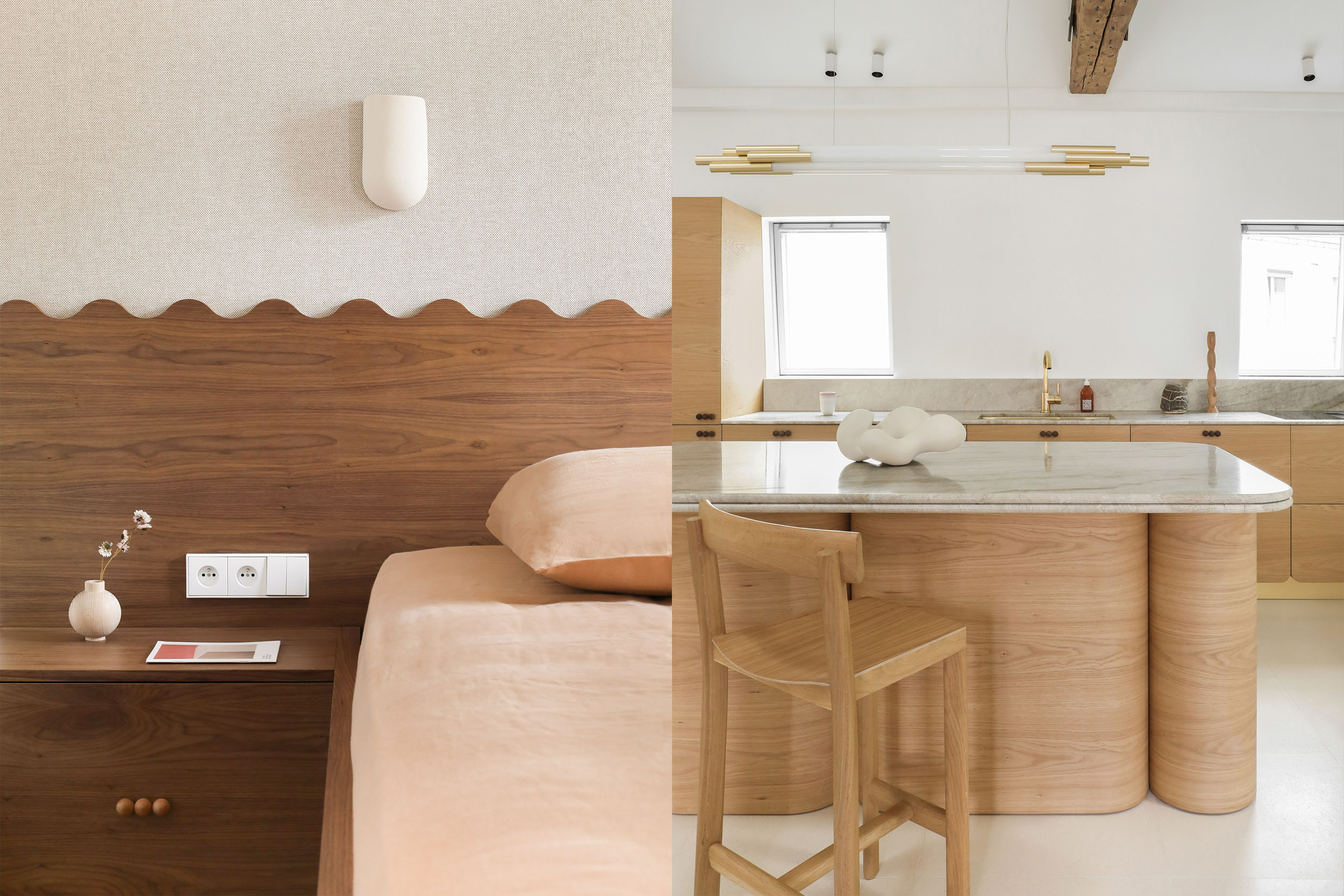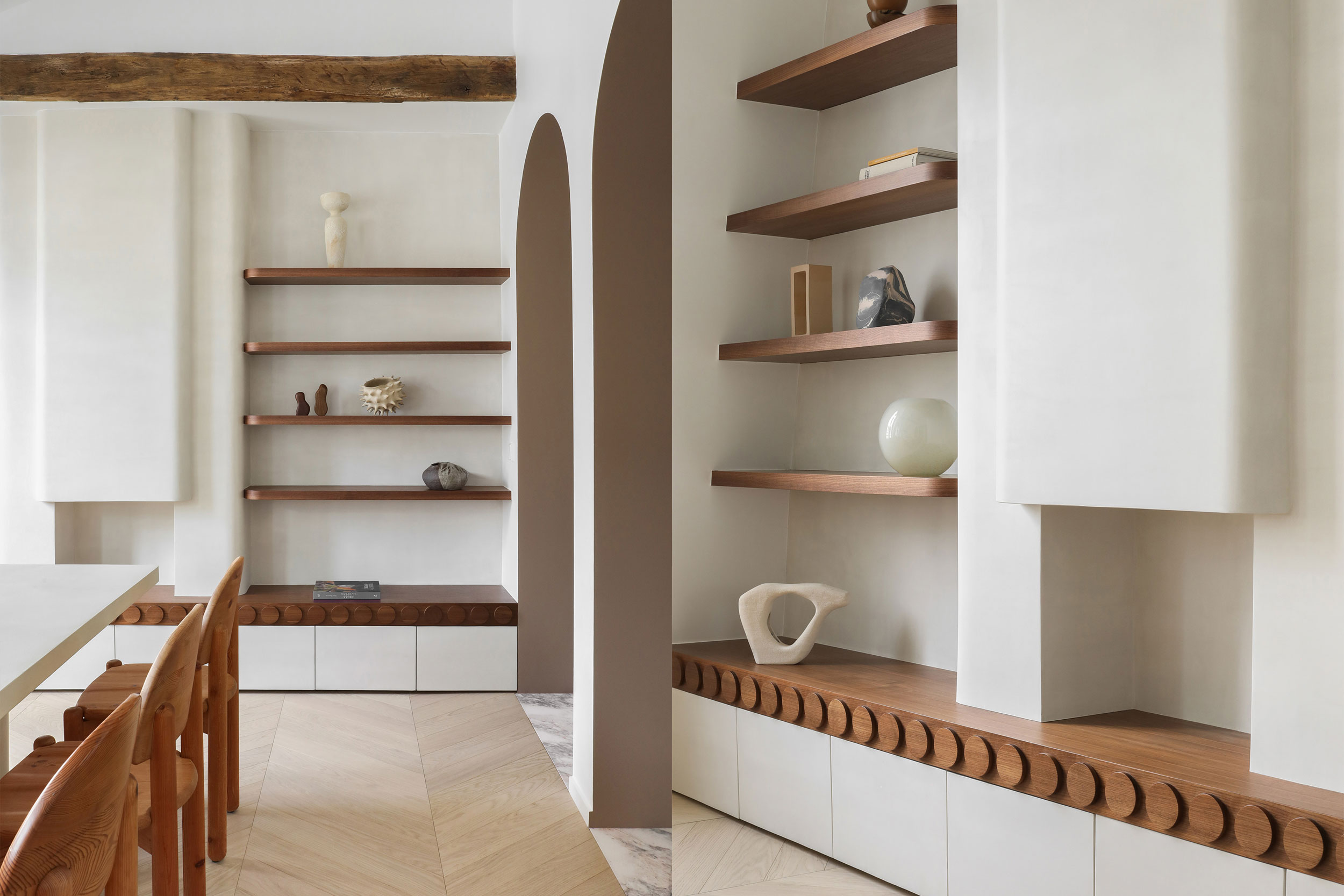 Les poutres apparentes en bois massif ont été conservées et mises en valeur, créant une tension élégante entre structure brute et volumes minimalistes.