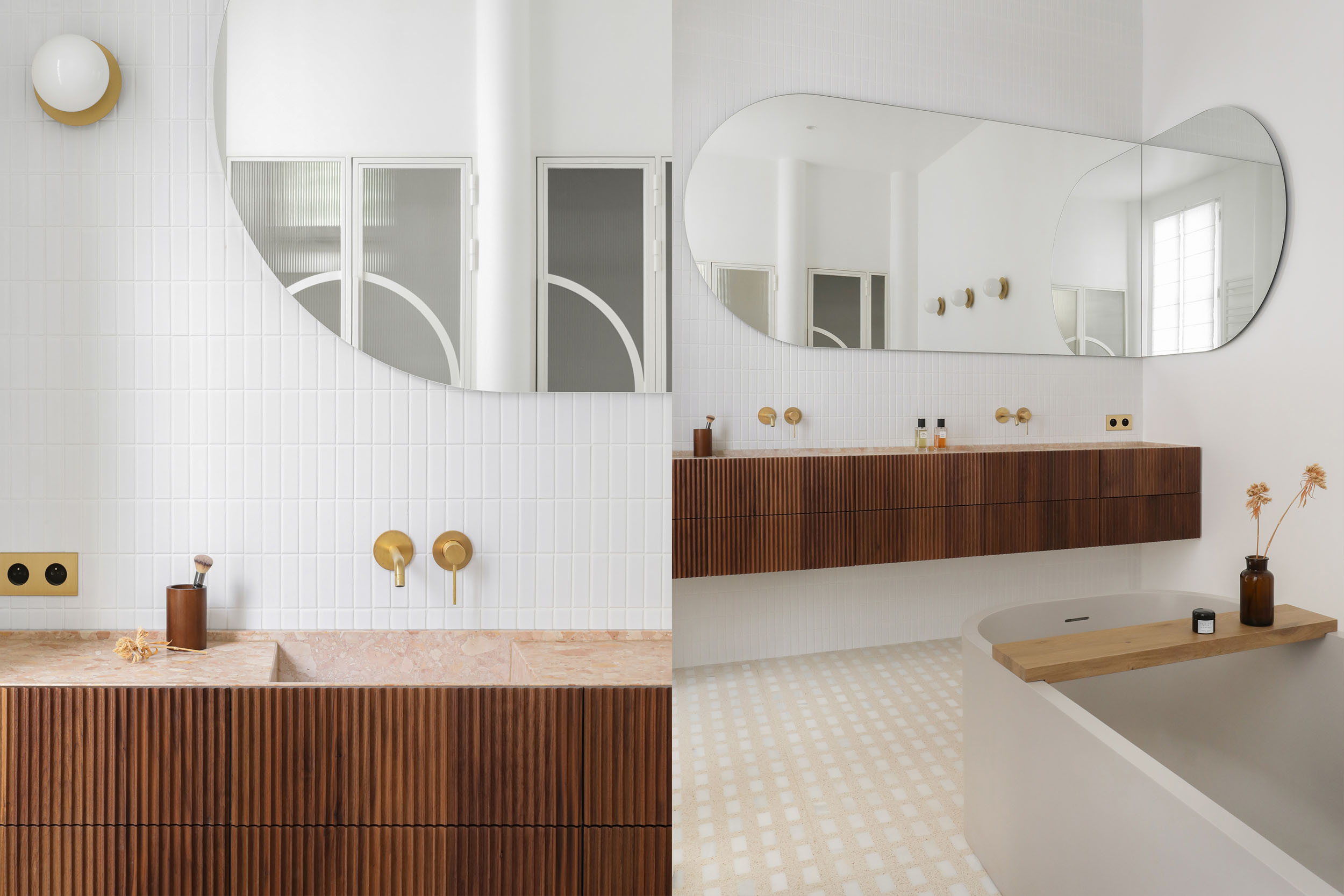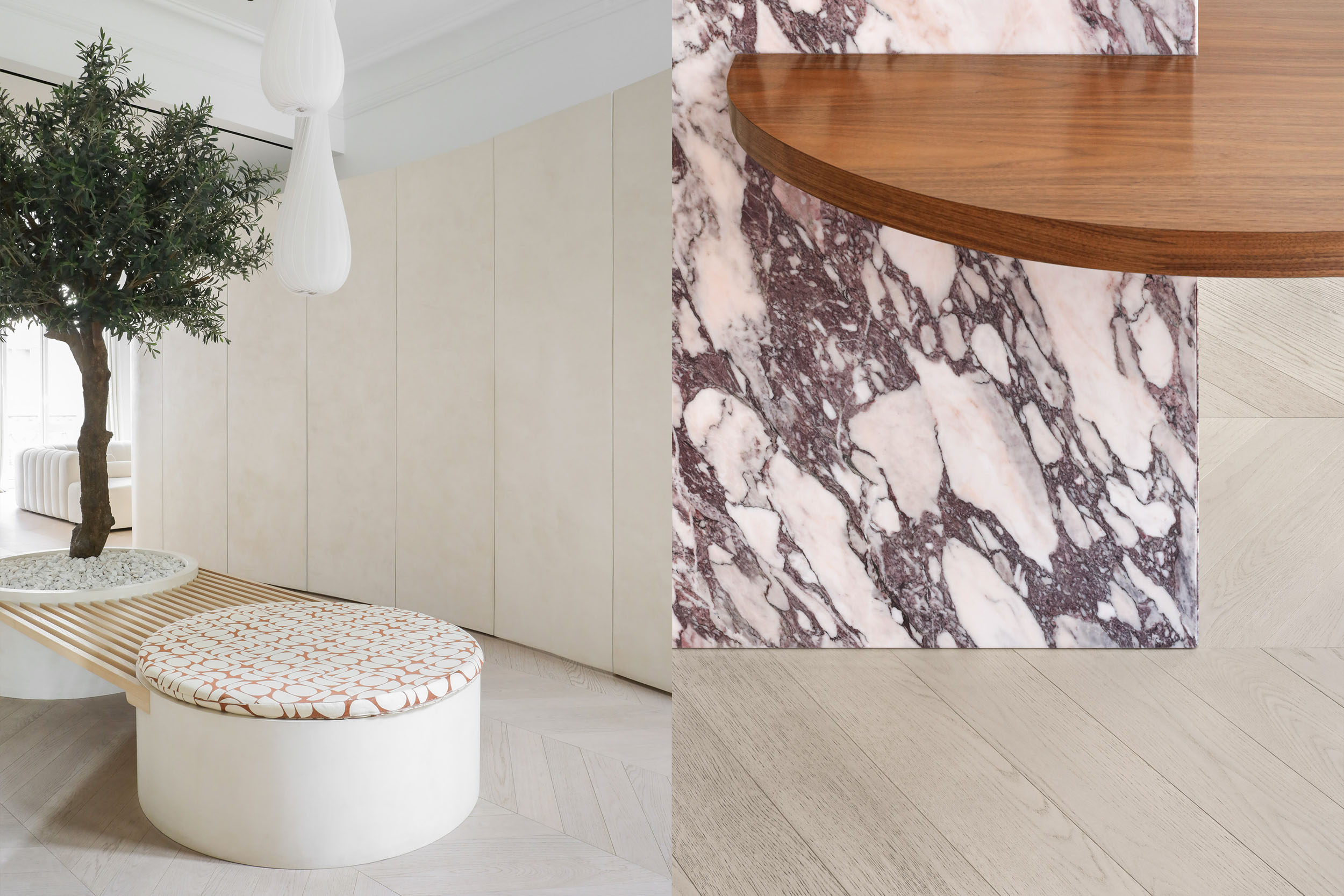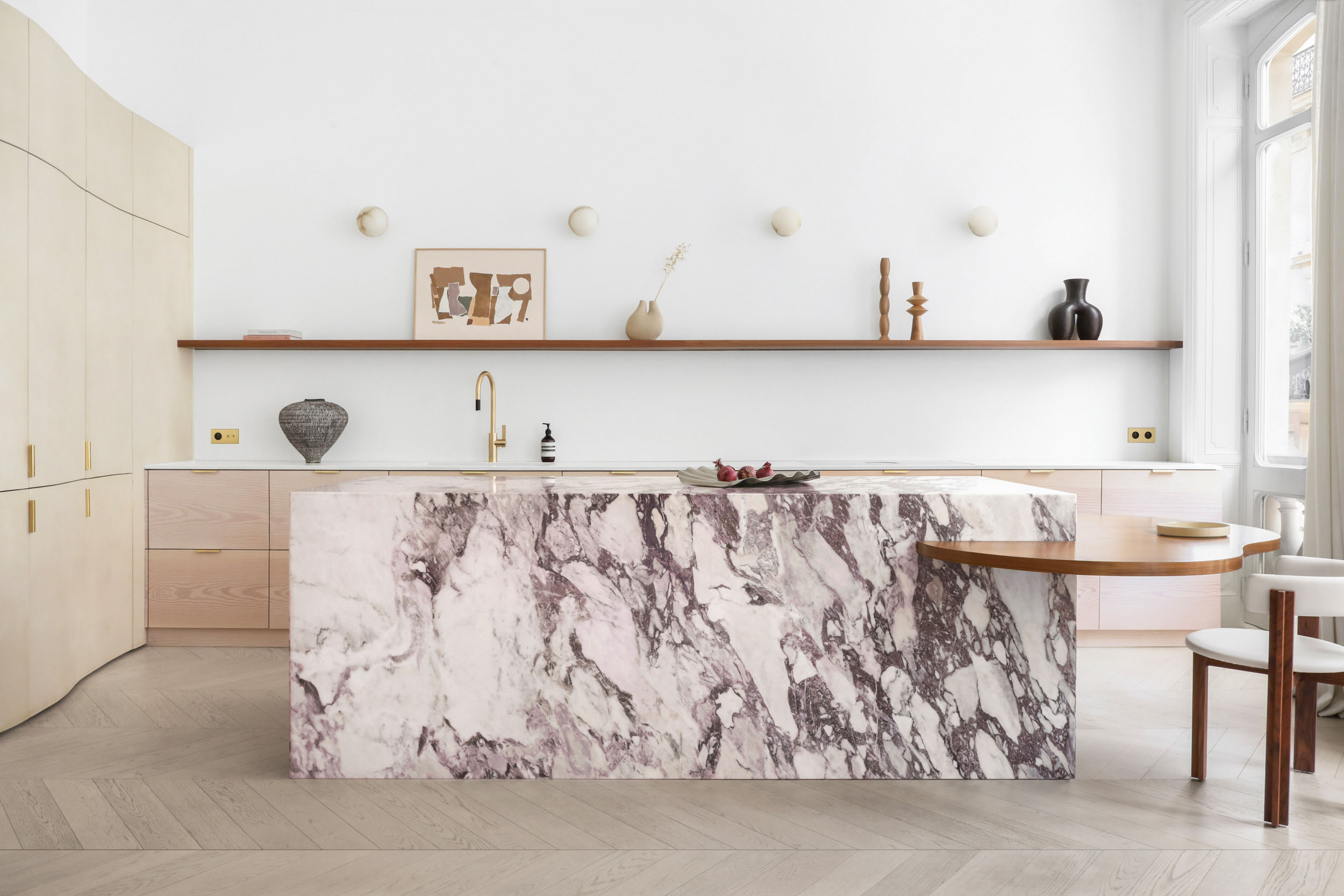 Le projet explore une esthétique douce et organique à travers des formes ondulées et un travail précis des matériaux nobles.